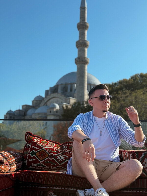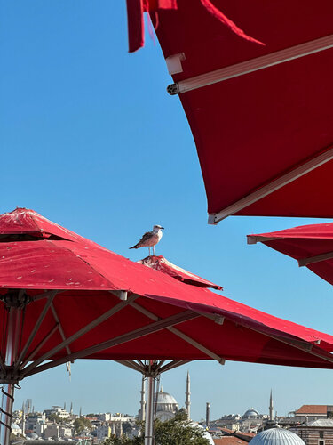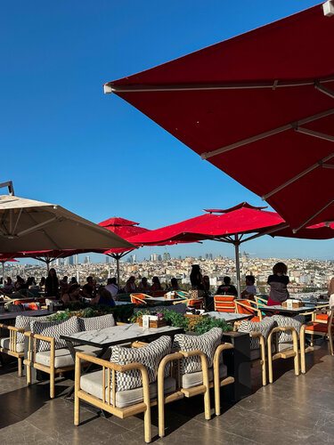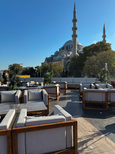 Стамбул умеет поражать своими видами — но Mimar Sinan Roof выводит это искусство на новый уровень. С одной стороны — величественная мечеть Сулеймание, с другой — блестящий под солнцем Босфор. И между ними — уютная терраса. Мы поднялись сюда ближе к полудню. Над городом чайки парили в небе, а на террасе неспешно завтракали туристы. Столы ломились от еды: сыры всех оттенков и вкусов, варенья, мёд, свежая выпечка, орехи, инжир… И всё это — часть легендарного турецкого завтрака, который здесь подают за 1750 лир. Говорят, его хватает на троих, и глядя на соседние столики, мы не сомневались: это пир на фоне самого красивого вида в Стамбуле. Но мы немного припозднились и на завтрак не успели. Вместо этого заказали Адана-кебаб и шиш-тавук— блюда, за которые Турцию невозможно не любить. Аромат острого жареного мяса, угли, дым, свежие лепёшки и прохладный айран — сочетание, от которого невозможно оторваться. Именно в таких местах чувствуешь настоящий дух Стамбула, попивая турецкий кофе и наблюдая, как над крышей пролетает стая чаек и скрываются где-то далеко за Босфором