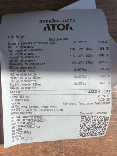 Пишу как есть. В эту столовую пошли почитав положительные отзывы, в целом, сказать про неё плохого ничего не могу, столовая как столовая, но цены конечно с отзывами не совсем сходятся, а нам было с чем сравнивать, в этой столовой мы потратили 1024 на двоих, взяли не много, по пол порции. Если сравнить с столовыми в Адлере, то там намного демократичнее цены, там у нас выходило в среднем по 600 рублей. Еда не сказать что вкусно, пойдёт для перекусить, подогревают в микроволновке-это минус. Не знаю, решать вам, можно думаю найти что-то лучше.