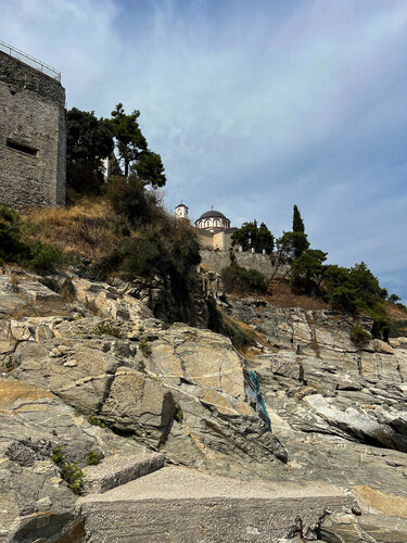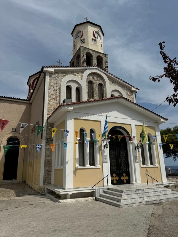 Интересное место. Сама церковь находится на возвышенности, нас это место привлекло ещё вечером с Кавалы. С города виднелся яркий свет в темноте на горе, это был подсвеченный крест. Так мы и решили сходить днём к церкви. От порта до церкви мы поднимались примерно час, пешком, можно конечно добраться на машине или автобусе, но мы решили прогуляться. Если пойдёте в жару берите с собой воду, воды у церкви нет. Если пройти ещё в гору минут 20ть от церкви по тропинке, вы как раз придёте к кресту на горе, бонусом за подъем будет красивый панорамный вид на город. У церкви есть беседка, там можно передохнуть или устроить пикник. Подробнее можно ознакомиться в дзен или вк Не На ДиВаНе