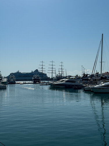 Красивый старый вокзал, сделанный ещё в Советские времена, на территории можно отлично провести время, посидев к примеру в кафе с видом на яхты и море, можно просто прогуляться и насладиться видами на стоящие корабли и яхты. С вокзала можно сплавать на одной из яхт за отдельные деньги, желающих вас прокатить будет немерено, т.к. яхтных приставал там огромное количество. Если пройти чуть дальше, то будет новый вокзал, современное здание, с нового вокзала отправляются Астория Гранде, паром в Турцию. Мы с этого вокзала отправлялись на Астории, в зоне ожидания мест много, есть вип зона, автоматы с напитками, магазинов нет. В знойную жару в зале прохладно, кондиционеры справляются, это плюс.