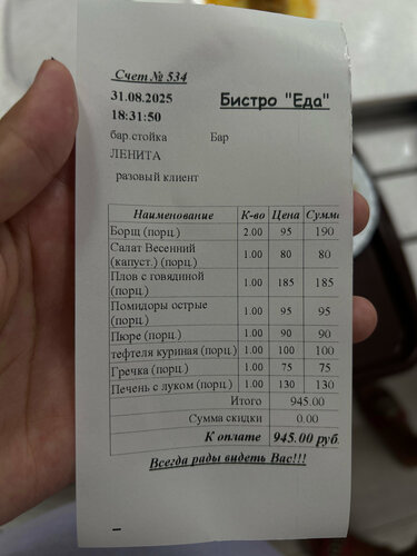 Еда вкусная, хотя бывает очень перченая и острая, лучше заранее про всё спрашивать. Борщ через раз очень острый. Обслуживание очень от настроения. Бывают приветливые, а бывает даже нахамить могут 🤷🏽‍♀️ Оплата только наличными, что в современном мире очень удручает. За что собственно и основной минус по звёздам. Во всех заведениях города уже можно без проблем расплачиваться картой. Тут же всё по старинке, обходят налоги. Настолько в открытую 🤦🏽‍♀️ Ценообразование ооочень странное: маленькая тефтеля стоит 100₽, а порция говядины 130₽. По ощущением - мяса в тефтели почти нет. Но она вкусная:)) Порция салата супер маленькая.