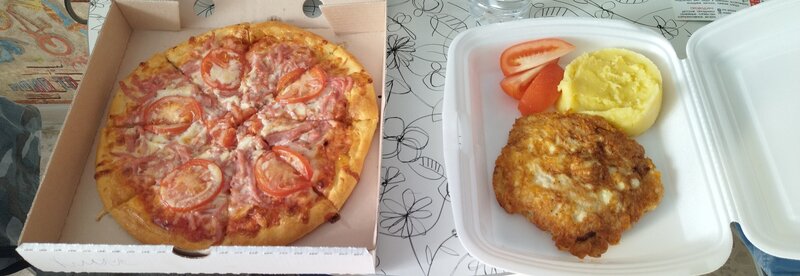 Обедал несколько раз, несколько раз заказывал еду на вынос. Почитал отзывы, народ про официантов пишет??? Я просто заказал за стойкой, оплатил, минут через 15 мне принесли суп куриный и картошку фри. Никаких официантов. Все мясное ждать долго, поэтому заказывал его только на вынос. Готовят норм. Цены средние. Май 2022 тарелка супа 140 р., порция-большая, мне хватало поесть без "второго", пицца 25 см. классическая 340р . Минус в том, что всякие мероприятия проходят в обеденном зале, в то время когда там кушают люди. Один раз обедал, во время празднования дня рождения ребенка лет 5. Громкая музыка, крики ведущих, визги детей, все это на пятачке между столами... Работающим завтракать не варик ибо работает кафе с 10 утра, можно заказать с вечера на вынос и позавтракать дома(в гостинице). Можно заранее позвонить, чтобы приготовили, меню есть в вк. Фотка то, что на вынос заказывал. Саму кафешку не фотал.