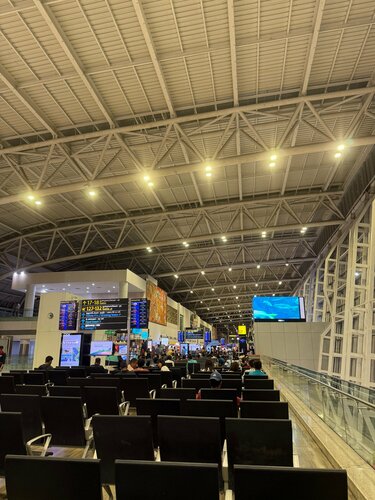 Конечно, для мегаполиса это большой аэропорт. Вход свободный, контроль, очередей нет. На первичный контроль международных рейсов было было всего 2 проверяющих, очередь заняла порядка 15 минут, далее контроль перед посадкой - китайский массаж в деле. Проверяют тактильно очень жёстко, все зажигалки заранее лучше скинуть в контейнеры по пути. Далее паспортный контроль, перед которым направляют служивые в зависимости от внешности ( азиаты или европейцы, - по моему мнению). После "границы" спуск в зал ожидания. Не ожидал увидеть пустой огромный аэропорт. Магазины Duty Free закрыты, был только один работающий, из которых я заметил 3 сектора - алко, табак, мелкий стед с конфетами, которые можно купить и у нас. Бизнес зал лайтовый, без китайских "пельмени", лапша, фрукты, пиво 2 градуса, вино китайское, виски. Дополнение от 7 февраля 2026: По прилету домой в своем закрытом чемодане обнаружил акт изъятия трех АКБ от новой видеокамеры