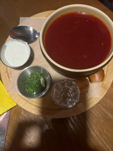 Обедали семьей в хуторке. Заказывали рыбу, скоблянку , салат и мясо в горшечке. Заказ приготовили быстро, все блюда были очень вкусными, красиво оформленными. Красиво оформленный новогодний зал, приветливые официанты, уютная атмосфера и приятная музыка