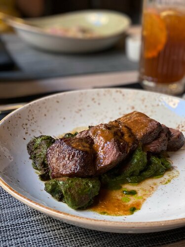 Были во Пскове проездом, поэтому заведение выбирали опираясь на отзывы. Заранее задали вопрос о скорости отдачи блюд, потому что были ограничены во времени. Нам ответили: «минут 10-15». В воскресенье вечером зал был полупустой, но это все равно никак не влияло на работу официантов, так как даже салфетницу на стол мы ставили себе сами :) В результате: по еде всё достаточно долго и очень средне. Странный слипшийся сыр в салате с «Говядиной и вялеными томатами». Наверное, потому что на него кладут тёплый картофель пай и это как-то нарушает технологию. То есть, ты перемешиваешь ингредиенты, а сыр так и остается цельным куском. В блюде «Томлённая свиная шея» мне очень понравился картофель. Вот он прямо вкусный был, в отличии от самой шеи, которая, на мой взгляд, прямо чересчур жирная. Будто бы ешь не совсем качественную тушенку. Брускеттам с креветками я ставлю плюс. Счёт нам несли около 15 минут, после того как мы сами подошли к официанту и его попросили. На вопрос: «всем ли мы остались довольны», мы прямо высказали своё мнение о блюдах. В ответ нам предложили комплимент от заведения в качестве извинений, но от него мы отказались, так как уже сильно опаздывали. Вывод: креветки вкусные, но больше, будучи проездом, мы сюда не придем. п.с. Хотя, очень напрягает, что во многих отзывах звучит фраза — «это лучший ресторан в городе». Если этот лучший, то страшно представить, что в остальных :)