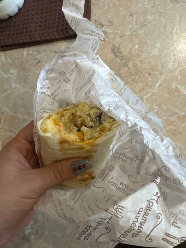 Ужастная шаурма,соус на вкус как будто смешали муку с водой,мясо безвкусное.Не рекомендую и сама купила в данном заведении первый и последний раз.К персоналу вопросов нет,они очень вежливы.