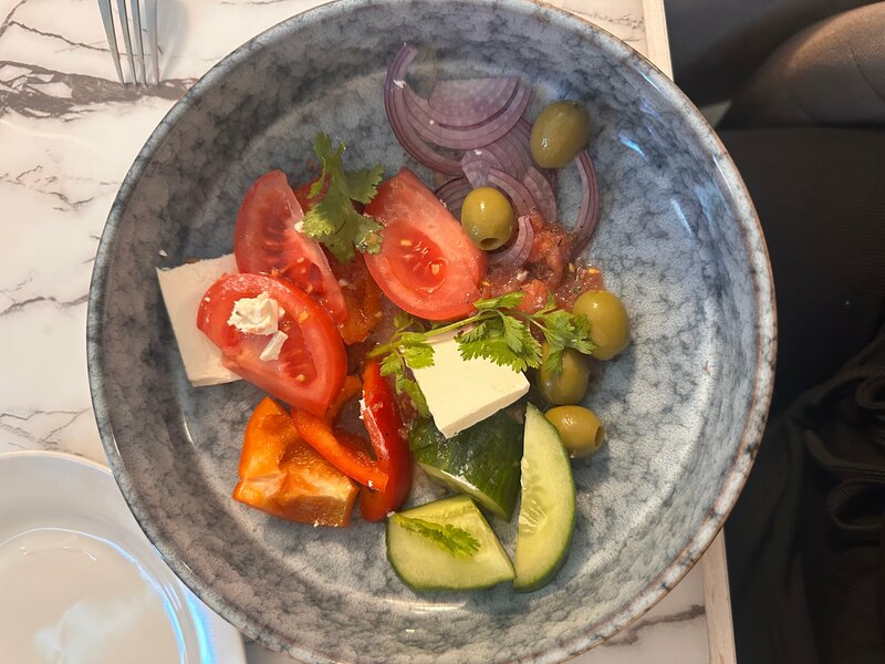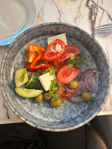 Отдыхали с друзьями в данном заведении. Заказала себе греческий салат, по итогу принесли непонятно что, не было никакой заправки и салат совершенно не соответствовал картинке меню данного кафе. Попросила исправить, на что мне ответили, что шеф-повар сказал, что переделать не сможет, я попросила хотя бы заменить оливки маслинами. Прикрепляю фото ожидание/реальность.