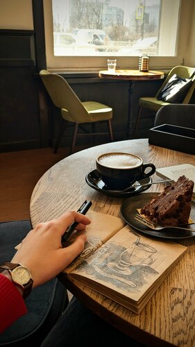 Очень понравилось место👌Приятный стильный и светлый интерьер. Важным критерием было наличие мест у окна, т.к. часто рисую в кофейнях. Также хочу отметить красивую посуду☺️