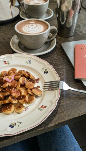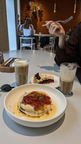 Место очень понравилось 🧡 Несколько залов и терраса, приятный интерьер, дружелюбный персонал. Отдельно хочу отметить стильное оформление меню (люблю такие детали). Пробовала панкейки с томатным вареньем (впервые пробовала подобное). Все было замечательно, обязательно вернусь ещё 🌸