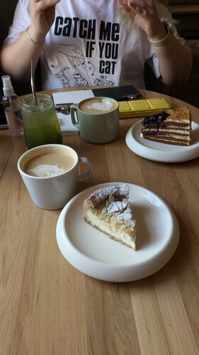 Уютное место, приятный интерьер, хороший сервис, есть места у окна (что для меня важно, т.к. часто рисую в кофейне🎨). Пробовала безумно вкусный пирог с грушей и сыром Дорблю😌