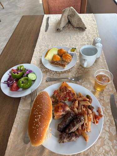 Отдыхала с 5-11.07.25. Обо всех плюсах и минусах. Сразу хочу сказать, минусы безусловно есть. Но все зависит, как к ним относиться. Мне они отдых не омрачили, и за них снимать звезду я не стала. Я летала одна на 7 дней (с учетом дороги) за 55к, считаю норм. Из них в самом отеле получилось ровно 5 дней и утро 6го. В целом отель достойный, хорошая 4ка. Итак, самый главный минус , это туалеты на пляже, они , конечно, давно требуют ремонта, очень тесные и убитые, и часто там не было воды. Душ там тоже оставляет желать лучшего, но пережить это можно. Нет кондиционеров или хотя бы вытяжки в туалете при ресепшене, честно сказать ходила туда часто, опять же , не смертельно. Нет кондиционеров ни на ресепшене, ни в лобби, но стоят обдувы , учитывая , что весь вай-фай там, то было б, конечно, не плохо кондеи там установить, но тоже это не так уж и критично. Еще один из минусов- постоянно не работала карта от номера, причем у многих. Приходилось идти на ресепшен, они ее перемагничивали. Последние три дня работала вроде без сбоев. Но тоже не понятно, почему бы не решить эту проблему, раз она возникает централизовано. Сперва считала, что минусом будет дорога до моря, но потом привыкла ездить. Море, а точнее бухта, куда возят от отеля, действительно далековато, на автобусе 10 мин, но по дороге можно осмотреть окрестности, понять их движение, в целом тоже познавательно. Пешком можно от бухты дойти до Старого города, где расположена мечеть. Также можно и до дикого пляжа вдоль берега прогуляться, взглянуть на открытое море. Насчет бухты- пространство ограничено для купания, но это делается в целях безопасности туристов. Из-за случаев с акулами так сейчас во всех отелях, за буйки заплывать нельзя. Море в бухте комфортное, кто с детьми -отличный вариант. Но кому хочется рифа, кораллов, рыб, а возможно и акул, и глубины, что дна не видно, - можно вправо от отеля дойти до платного пляжа, 15мин пешком, 4$ вход, там вход в море с понтона и сразу бездна. Народа на море и в отеле немного, отель небольшой, нет очередей в ресторан, на море тоже много свободных лежаков, ночью тихо, спокойно, никто не орет, это огромные плюсы. Бассейн большой и чистый. Особо хитрые оплачивают работнику, кто раздает полотенца, чтоб тот им занимал шезлонги с утра у бассейна. Питание достойное. Ресторан чистый. Посуда тоже норм. Очень много десертов и на завтрак, и на обед, и на ужин. Всегда есть , что поесть. И омлеты, и глазунья, и яйца. Круассаны, кофе. Еспрессо вкусный в автомате. Попробовала капучино - не понравился, много воды. Молоко можно налить самостоятельно. На обед и ужин и макароны и фри и рис, и овощи в кляре,и свежие овощи, и говядина , люля, и курица, на любой вкус. Дыня, апельсины.В баре можно бесплатно пить напитки, коктейли, пиво и прочее. На пляже в баре бесплатная только газировка. Перекуса нет. Но в целом между приемами пищи голодная я не была совсем, хотя старалась не объедаться. Был конечно очень неприятный момент за обедом, возможно за это стоит и звезду снять, это пучок волос в овощном салате, именно пучок, ни то волос, ни то шерсти, впредь клала овощи по отдельности. Номер мне дали большой просторный с видом на бассейн. Ничего не доплачивала, прилетела ночью. Убирали каждый день. Можно придраться к пыли, грязным ручкам на мебели, в туалете у раковины не работал дозатор для мыла. Ватных палочек нет, берите с собой, это не 5*. Ша