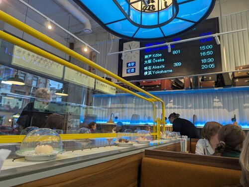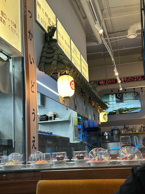 Заведение очень классно выглядит внутри. Еда, которая на ленте, неплохая, но и не вау -твердый середняк. Официанты, честно говоря, хоть и приветливые, но не реагируют на вас, когда вы их зовёте, при условии, что посадка -3 столика, которые по большей части обслуживает лента. Напитки правда разбавлены, но мне это даже понравилось: обычно пьешь один сироп, а тут и вкус, и свежесть есть. Мы сидели возле поваров, и они были более внимательны к нам, чем официанты. Мы просили у них блюдо под заказ, и они нам его через 2 минуты отдавали - очень приятно. Считаю, что это заведение на твердые 4,8. Концепт прикольный, еда норм, красивенько. И моти очень вкусные, советую