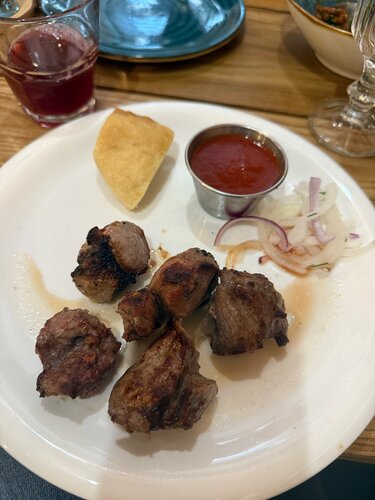 Ожидание/реальность фото «царской» ухи в меню и в реальности только бульон. Подача шашлыка 😅 с сухим лавашом. А баклажаны с орехом опасно есть, внутри скорлупа от орехов 🥴