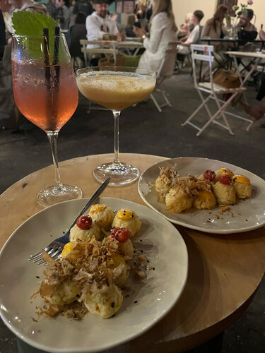 были в заведении два дня подряд. в первый день (четверг) попали на акцию «любой коктейль за 11 р». попробовали почти все позиции, есть как и покрепче, так и слабенькие коктейли. из закусок решили взять сет дичек (нам больше всего понравилась с креветкой). очень атмосферная летка с фонариками и качелями. на следующий день уже был дождь, поэтому решили посидеть внутри заведения. внутри тоже довольно уютно, но душновато. взяли попробовать сет настоек из 8 шт (по опыту настоек в Минске думали что они будут слабенькие, но нам хватило и 4 шт, чтоб почувствовать что спирта там достаточно). из закусок несколько раз брали спринг-роллы разные, тоже очень вкусные оказались. однозначно вернемся и рекомендую к посещению