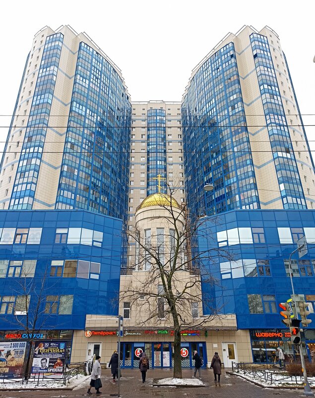Очень странное, практически невообразимое и совершенно безумное архитектурное решение, на мой взгляд. Особенно сильно радуют (читай - ошеломляют до глубины души) "Пятёрочка" и "Улыбка радуги" на авансцене. Дорогу переходить я, конечно, не стала (торопилась), но до сих пор сильно озадачена вопросом, где именно находится вход в храм. Искренне надеюсь, что не через эти два магазина, хотя это как будто выглядит вполне себе очевидным на первый взгляд. Очень интересно, кто это спроектировал и кто выдал разрешение на строительство очередного "восьмого чуда света"... С перебором урбанистично смотрится.