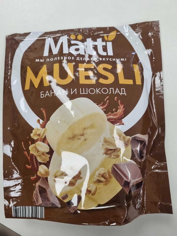 Бомбически вкусно мюсли, кусочек шоколада, изюм и банан, сфотографировала, заправила биойогуртом, но лучше йогуртом не густым, мне очень понравилось, это очень вкусно, все кусочками и шоколад и банан и изюм, все это реально там есть.буду теперь покупать!!!!кто на диете-это идеальный завтрак!покупала за 139р