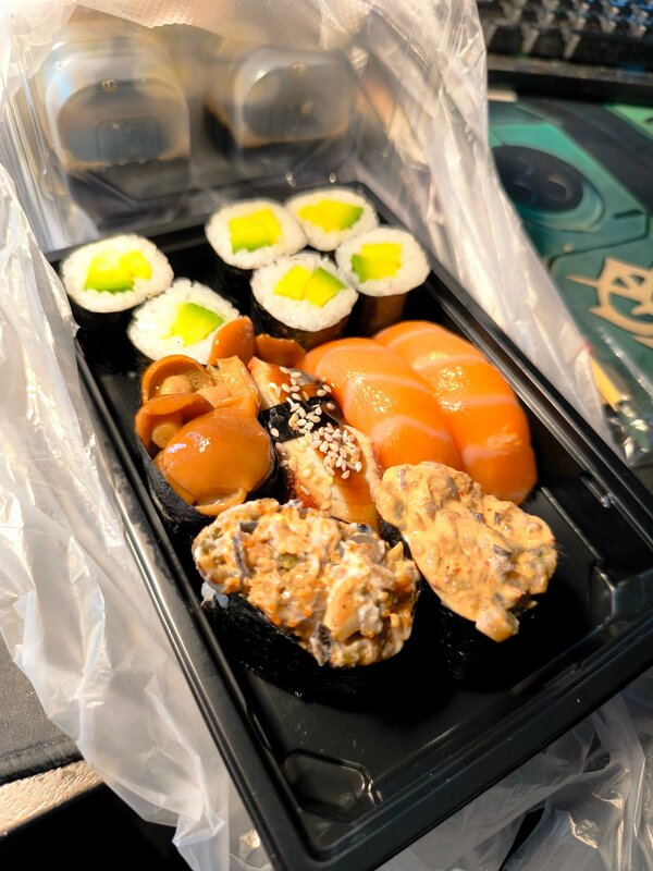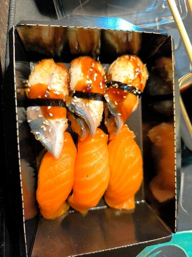 Суши средние по качеству, рыба эконом, роллы тоже средние, гунканы- осторожнее с мидиями, плохо промыты, попадаются кусочки раковин и песок. Авокадо в роллах вкусный. Рис пресный, но сварен вроде нормально.