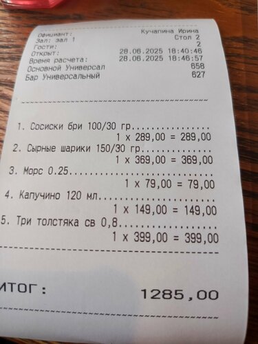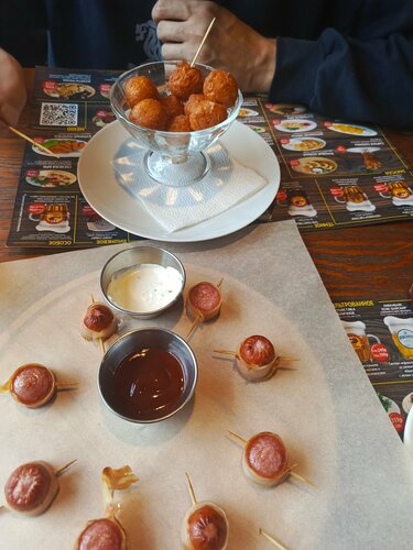 Цены жуть. Сосиски бри - это прикол какой то? Не сосиски, а сосиска! Ценой как за крыло Боинга. Шарики сырные, это как имитация икры. Сыра ноль. Тягучести никакой. За то очень хорошо чувствуется мука... Пиво хорошее. Кофе тоже. Морс очень сладкий и ягодного вкуса нет.