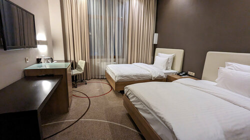Отличное место для комфортного отдыха в центре города. Гостиница расположена прямо на улице Красной — главной пешеходной улице Краснодара. Номер был просторным, чистым, с хорошей шумоизоляцией и всем необходимым для удобного проживания. Интерьер выполнен в спокойных тонах, кровати удобные, а мягкая зона с креслами и журнальным столиком добавляет уюта. Ванная комната также порадовала — современная, с хорошим напором воды в душе и стильной отделкой. Отдельно хочется отметить завтраки, которые подаются на первом этаже. Ассортимент просто впечатляющий: от свежей выпечки и фруктов до каш, мясных блюд и овощей. Особенно порадовало, что омлет или яичницу можно заказать индивидуально у повара, выбрав добавки по вкусу. Из неожиданно приятных деталей — на завтрак подают шампанское. Но, пожалуй, главной «фишкой» отеля стала прачечная для гостей, расположенная на 7 этаже. Там установлены стиральная машина Electrolux EWF 126210 A и сушильная машина Electrolux EDC 46130 W. На баре можно купить капсулу для стирки. Машины современные, после сушки вещи почти сухие и готовы к носке. Единственный момент — нигде не указано, сколько времени занимает цикл стирки. Мне удалось выяснить, что программа «Хлопок Цветное 30°» длится примерно 1 час 30 минут. Было бы здорово, если бы отель добавил эту информацию на памятке рядом с машиной. Гостиница оставила исключительно положительное впечатление. Уровень сервиса соответствует бренду Hilton, персонал вежлив и всегда готов помочь. Обязательно остановлюсь здесь снова и рекомендую к посещению.