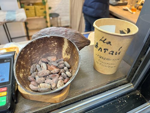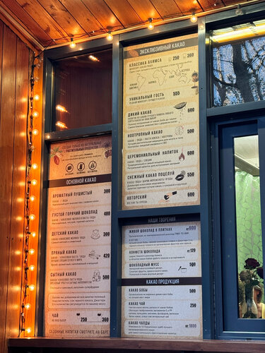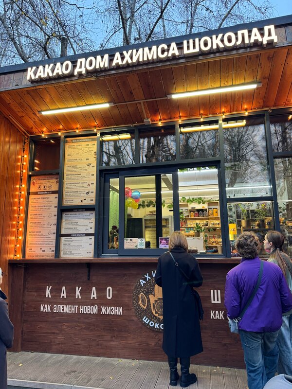 Вкусный какао, готовят персонально под каждого покупателя, поэтому ждать приходится довольно долго. Парк не разрешает собственникам установить скамейки, столики со стульями, поэтому долго стоишь в очереди, затем гуляешь с какао по парку. Сам какао вкусный, рекомендую покупать с пряностями, с добавлением каких-нибудь вкусов или сахара. Классический какао мало кто поймёт - не сладкий, горьковатый напиток, на любителя. Но бобы натуральные, поэтому прилив бодрости после такого напитка реально ощущается. Самый слабенький - детский какао. Шоколадные плитки довольно дорогие, но очень вкусные, рекомендую классический шоколад без наполнителей, он немного сладкий, очень приятный на вкус.