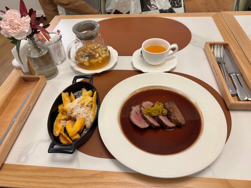 Приятный ресторан, можно вкусно полноценно поесть, либо попить чай с вкусными десертами, либо просто купить вкусный испеченный здесь хлеб. Обслуживание отличное. Удобно, что есть кнопка вызова официанта на столе. Стейк из конины сочный и нежный, но лучше бы его готовили не со сладким соусом, а на гриле с крупно зернистой солью - было бы намного вкуснее. Цены средние.