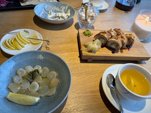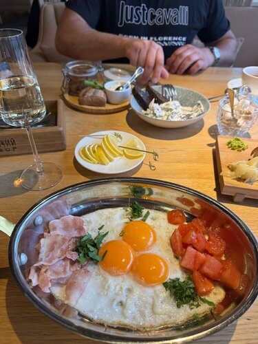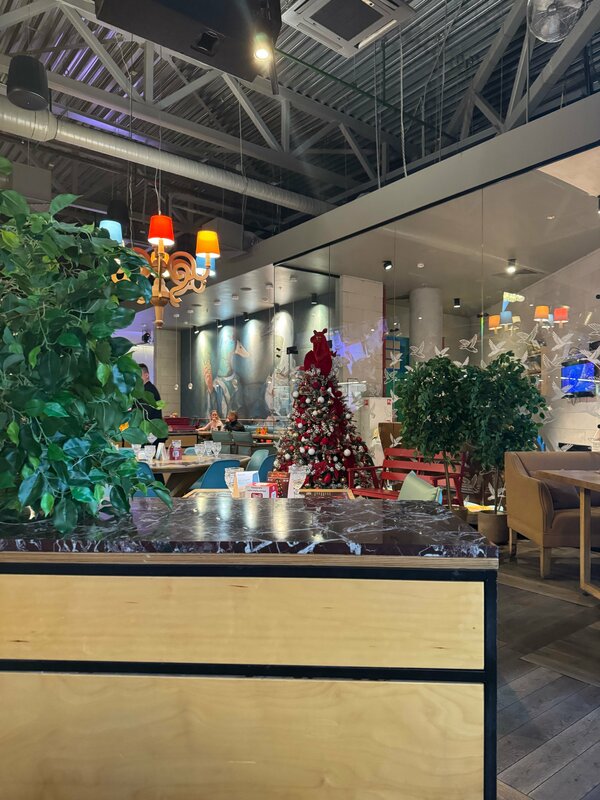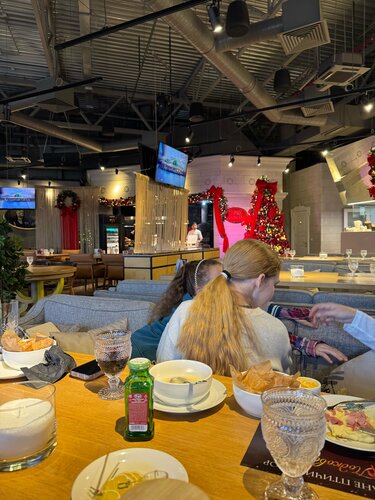 Очень разнообразное меню. Есть детское меню тоже. Игровая открыта каждый день, но по выходным с 14:00 есть няня, что очень удобно, нашим детям нравится. Очень красиво украшено перед Новым годом: обалденные ёлки с игрушками и бантами. Обширная винная карта. Столов много и, что очень удобно, они не плотно натыканы, так что довольно комфортно. По вечерам есть живая музыка. Есть подземный паркинг и лифт из него сразу в ресторан. Комфортное обслуживание.