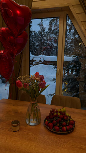 Прекрасное место для отдыха, очень отзывчивый и добрый персонал. Домики чистые и уютные , в доме есть все необходимое. Отличный чан с еловыми ветками и грейпфрутом.Были к сожалению всего одни сутки, но хотелось остаться там еще как минимум на неделю , очень тихая местность. Огромное спасибо за шарики и цветочки в честь 14 февраля , было очень приятно. Вернёмся туда снова 🫶