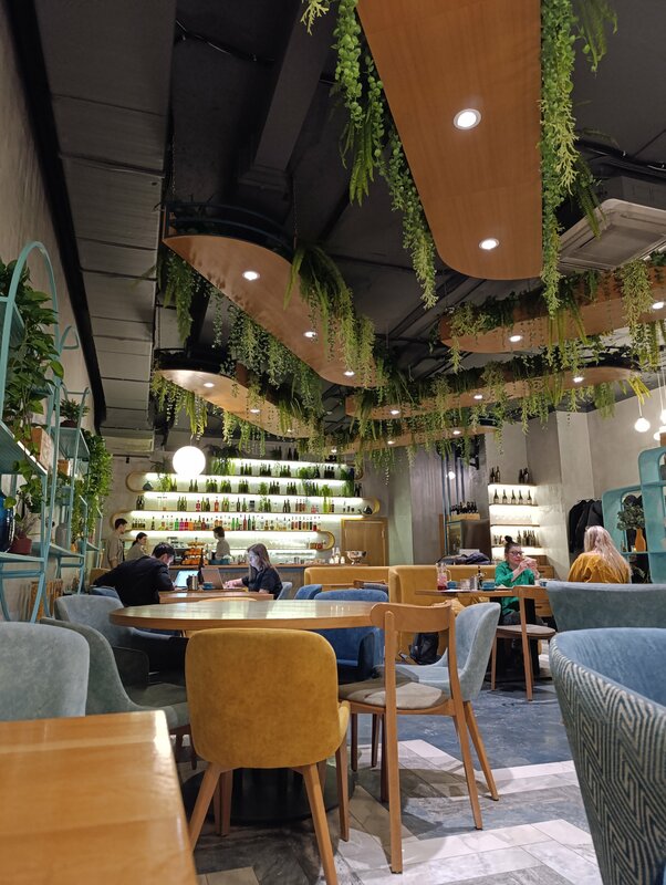 В целом в заведении приятно находится, хороший сервис — если вы туда идете поболтать, провести время; если идете кушать, то еда пустая, вроде все красиво выглядит, тарелка не пустая но вкуса практически у блюда нету — будто сэкономили на ингредиентах. Дополнение: ел суп куриный (бульон пустой как похлёбка), тальятелле с курицей (паста была альденте и достаточно не комфортно ее было есть (хотя даже альденте не должна вызывать дискомфорт при еде), соуса была мало а вот к самой курице вопросов нету), салат на лепешке (вот он прям супер вкусный был, лепешка ещё такая воздушная и все ингредиенты не перебивали друг друга а лепешка своей нейтральностью просто заполняла все пустоты), и белый чай (он прям супер слабый был, вот лучше бы пакетированный принесли, на мой ответ что чай пустой - ответили просто "он просто заварочный"; как пример чай в ту же цену в Тан Жен это Ду Хан Пао и он действительно даёт терпкий вкус в начале и древесный вкус во рту после глотка).