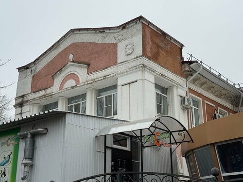 Удивительно, как можно было так испохабить это здание, чудом пережившее войну. Вместо красивого, симметричного входа - теперь стеклянная кубышка. Часть фасада в сайдинге, другая за забором. Детали фасада разрушаются и кое-где заботливо прикрыты рекламными щитами. Вокруг разруха. Главная строка с сайта медицинской клиники, размещающейся в этом доме: «В нашей клинике вы не тратите деньги на лечение, вы инвестируете их в свое здоровье». Ну нельзя же так. Уберите всю эту лабуду начала лихих девяностых. Инвестируйте в здоровье исторического здания.